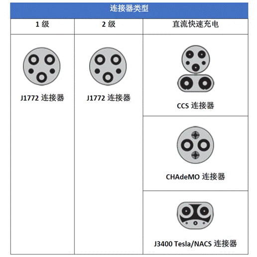就像我們有不同的充電機級別來區(qū)分功率級別一樣,充電機所使用的連接器也有不同的標(biāo)準(zhǔn)。