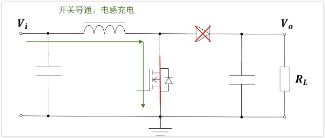 在開關(guān)導(dǎo)通時,電感L接地,二極管截止,輸入電壓Vi對電感L進行充電,電感兩端電壓是Vi。
