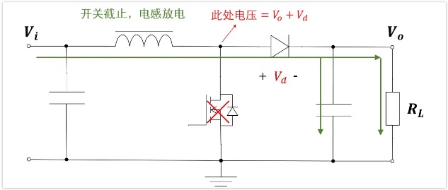 因為這是升壓boost電路,所以Vo+Vd會大于Vi,電感此時放電,給負載供電,并且給輸出濾波電容充電。