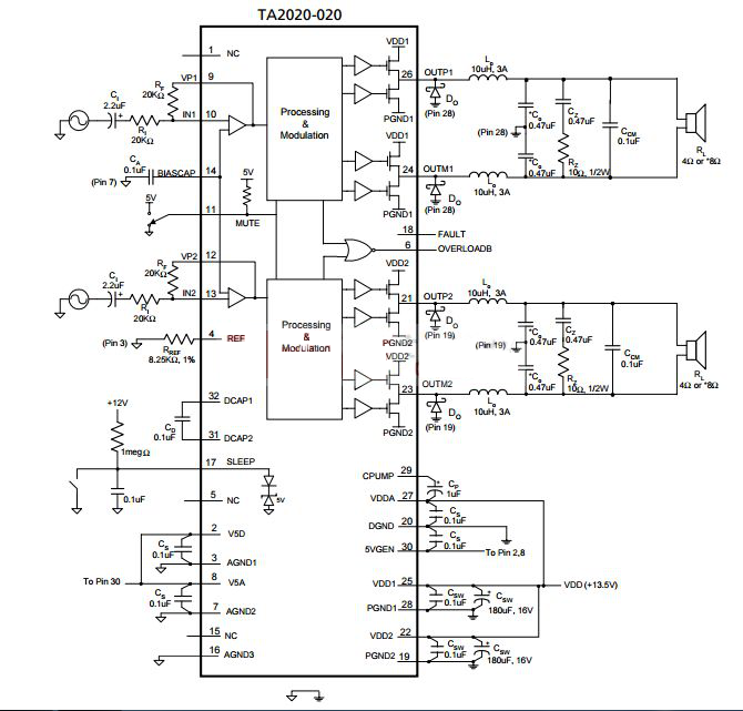 上圖是TA2020的內(nèi)部模塊構(gòu)造,從上圖上可以看出,該芯片內(nèi)部主要集中了處理和調(diào)制模塊,從而實現(xiàn)高品質(zhì)音頻的特性。