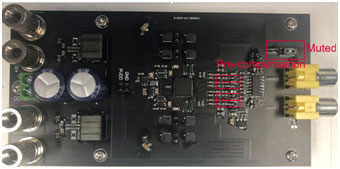 Figure 7 該平臺(tái)用于爆裂噪聲評(píng)估,V-Meter可以測(cè)量直流偏置電壓,Sound meter可以測(cè)量來(lái)自揚(yáng)聲器的爆裂噪聲的聲壓。靜音按鈕用于將功率放大器從靜音切換到取消靜音或從取消靜音切換到靜音,Sound meter的麥克風(fēng)傳感器與揚(yáng)聲器在同一條線上,Sound meter將測(cè)量揚(yáng)聲器的聲壓級(jí)。該平臺(tái)設(shè)置在靜音室中,然后分別進(jìn)行有預(yù)補(bǔ)償和無(wú)預(yù)補(bǔ)償?shù)臏y(cè)試,數(shù)據(jù)列在以下表格中。