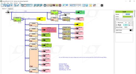 在考慮這一點的情況下,先創(chuàng)建真實的功率預算,然后選擇控制器。包括您所需的所有電源電軌:2.5 V、3.3 V、5 V等。包括所有會消耗每個電軌功率的上拉電阻、離散器件和IC。使用這些值反向工作,以如圖2b所示,估算您需要的電源。使用電力樹系統(tǒng)設計工具,例如LTpowerPlanner(圖3)來輕松創(chuàng)建支持所需的功率預算的電力樹。