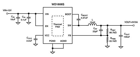 WD1606S支持4.5V 至 36V 的寬輸入電壓以及 -40℃ 到 125℃ 的寬工作溫度下可持續(xù)輸出3A電流,靜態(tài)電流低至 85μA。可用于低串數電池(8 串電池以內)的應用,將電池包的電壓轉換為更低的電壓給后級負載供電。得益于優(yōu)秀的低靜態(tài)電流,超低關斷電流特性及優(yōu)秀紋波和瞬態(tài)性能使其成為工業(yè),電動工具,及消費電子市場DCDC產品的理想之選。