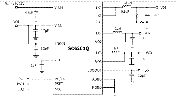 由于生產(chǎn)商的差異,不同車載攝像頭模組的驅(qū)動(dòng)電壓設(shè)置和序列控制各不相同,需要外部元件配置。SC6201Q 可通過(guò)在 SEQ 和 RSET 引腳對(duì)地連接不同電阻來(lái)配置調(diào)整 CMOS 圖像傳感器的上電時(shí)序和模擬供電電壓,系列后續(xù)產(chǎn)品還計(jì)劃通過(guò) I2C 接口直接配置,進(jìn)一步減少外部元件數(shù)量,簡(jiǎn)化模組電源設(shè)計(jì),讓車載攝像頭模塊更加小巧。