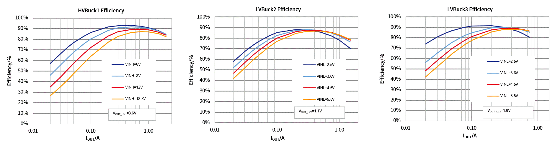 憑借南芯在降壓轉(zhuǎn)換器領(lǐng)域的豐富積累,最新車載攝像頭 PMIC 系列支持寬輸入電壓,擁有出色的能量轉(zhuǎn)換效率。以 SC6201Q 為例,其高壓降壓轉(zhuǎn)換器支持 4V 到 19V 的輸入電壓,以及可調(diào)的輸出電壓和 2A 輸出電流,為低壓降壓轉(zhuǎn)換器和 LDO 供電。低壓降壓轉(zhuǎn)換器的輸入電壓范圍為 2.7V 到 5.5V,采用固定輸出電壓,支持 1.5A 和 0.75A 的輸出電流。降壓轉(zhuǎn)換器的峰值效率分別可達(dá) 93.0%、87.4%、91.7%。