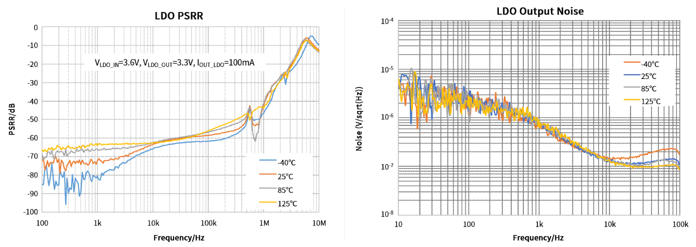 芯片集成的 LDO 同樣具備高穩(wěn)定性,1kHz 環(huán)境下的電源抑制比 (PSRR) 可達(dá) 70dB,典型場(chǎng)景下的輸出噪聲低至 60μV。