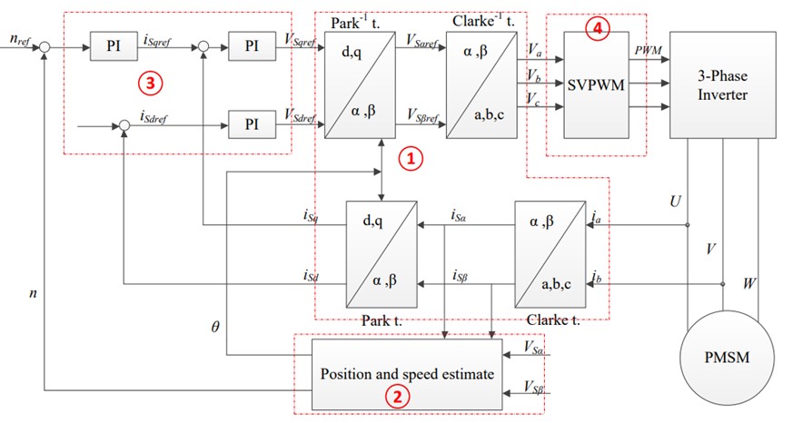 FOC控制框圖如圖5所示,其中包括:①坐標(biāo)變換,包括Clarke/Park變換和Clare/ Park逆變換②位置和速度估計(jì)算法③PI控制,包括兩個(gè)電流(d/q軸電流)PI環(huán)路和一個(gè)速度PI環(huán)路④SVPWM模塊。