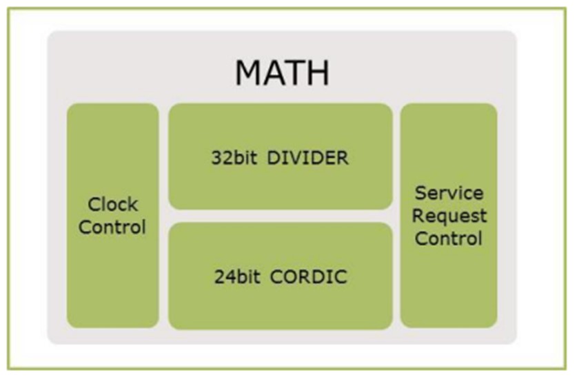 XMC1302中集成一個(gè)MATH協(xié)處理器,它完全獨(dú)立于CPU,工作在PCLK(64MHz)時(shí)鐘下。MATH協(xié)處理包含了一個(gè)32位的DIVIDER和一個(gè)24位的CORDIC。DIVIDER單元實(shí)現(xiàn)32bit有符號(hào)/無(wú)符號(hào)除法。CORDIC單元實(shí)現(xiàn)24bit三角函數(shù)運(yùn)算。DIVIDER和CORDIC單元可并行工作,該模塊減輕了CPU的負(fù)荷,對(duì)于實(shí)現(xiàn)無(wú)感FOC控制算法提供了良好的支持。