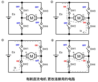 有刷直流電機(jī)通常具備兩個(gè)電源接線(xiàn)端子,通過(guò)這兩個(gè)端子施加電壓以驅(qū)動(dòng)電機(jī)。這兩個(gè)端子存在以下四種基本的連接方式: