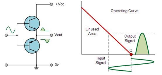當(dāng)輸入信號(hào)變?yōu)檎禃r(shí),正偏置晶體管導(dǎo)通,而負(fù)晶體管則切換為“OFF”。同樣,當(dāng)輸入信號(hào)變?yōu)樨?fù)值時(shí),正晶體管切換為“OFF”,而負(fù)偏置晶體管則變?yōu)椤癘N”并傳導(dǎo)信號(hào)的負(fù)部分。因此,晶體管只有一半的時(shí)間導(dǎo)通,無論是在輸入信號(hào)的正半周期還是負(fù)半周期。