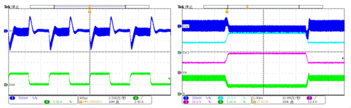 左:SC87550Q 負載瞬態(tài)響應(輸入電壓 12V,輸出電流壓擺率 0.1A/μs;輸出電壓 20V,輸出電流 0-5A-0),右:SC87550Q 線路瞬態(tài)響應(輸入電壓 9V-18V,步長 30mV/μs;輸出電壓 20V,輸出電流 3A)