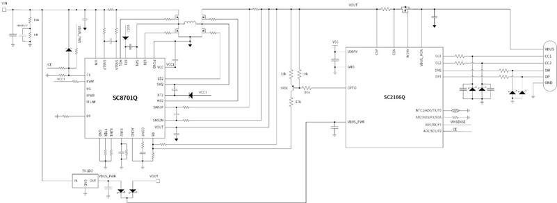 SC2166Q 基于高度集成化的設計,采用 24 引腳 4mm*4mm QFN 封裝,集成物理層、電壓和電流傳感、數模/模數轉換器、門驅動、接口、保護電路等多種元件,最大限度減少外部組件,為車充應用提供高性價比的解決方案。