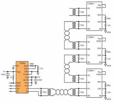 圖 5.LTC6804 支持隔離式 SPI 接口,可通過菊花鏈方式連接構(gòu)成更大的陣列,從而實(shí)現(xiàn)可靠 的抗電磁干擾互聯(lián),盡量降低布線要求,減少隔離器數(shù)量