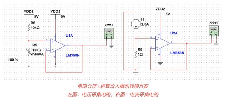 這種場景的電平轉換比較麻煩,沒有集成芯片可以用,常用的就是電阻分壓+運算放大器的轉換方案,下圖分別為常用的電壓采集和電流采集電路,在電壓采集電路中,輸入模擬量為5V,利用分壓電阻,輸入到電壓跟隨器的電壓就是2.5V,那么輸出就是2.5V。在面對不同模擬量時,只要選擇合理的電路轉換模型就可以了。