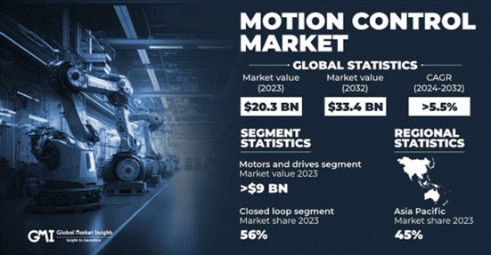 隨著工業(yè)自動化、智能制造和物聯(lián)網(wǎng)的發(fā)展,市場對運動控制解決方案的需求持續(xù)增長。作為驅(qū)動機械運動的關(guān)鍵技術(shù),電機和運動控制系統(tǒng)被廣泛應(yīng)用于工業(yè)自動化、機器人、消費電子、醫(yī)療設(shè)備、自動駕駛以及智能家居等多個行業(yè)。據(jù)市場調(diào)研公司GMI預(yù)測,2023年,全球運動控制市場的規(guī)模約為203億美元;市場預(yù)計在2024至2032年期間的復(fù)合年增長率(CAGR)為5.5%,2032年,市場規(guī)模預(yù)計達(dá)到334億美元。