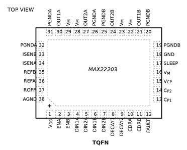 MAX22203具有過流保護(hù)(OCP)、熱關(guān)斷(TSD)和欠壓閉鎖(UVLO)功能。每次檢測到故障條件時,都會激活一個開漏低電平有效nFAULT引腳。在熱關(guān)斷和欠壓鎖定期間,驅(qū)動器為三態(tài),直到恢復(fù)正常工作為止。該期間采用小型TQFN38 5mm x 7mm封裝。