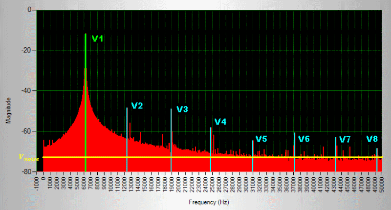 為了可視化 ADC 輸出中的諧波失真,我們將提供一個正弦波作為 ADC 的輸入,并繪制 ADC 數(shù)字輸出的傅里葉變換(又名 FFT)。圖 1 顯示了此類 ADC 輸出的 FFT 示例。理想情況下,F(xiàn)FT 應(yīng)在正弦波頻率處具有單個頻率尖峰。盡管輸入信號的頻率在 FFT 圖中具有幅度(FFT 中的綠色莖),但圖中還可以看到其他頻率內(nèi)容。輸入信號頻率稱為基頻。除了基頻分量之外,F(xiàn)FT 中還會周期性地出現(xiàn)尖峰(藍(lán)色莖)。這些是輸入信號頻率的諧波。