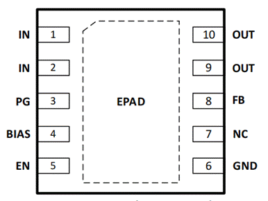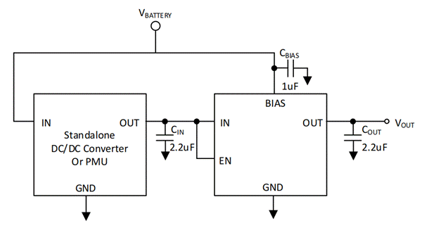 主電源路徑通過VIN,可連接至僅高于輸出電壓的值低至 150mV 的電源。該器件使用一個用于為 LDO 的內(nèi)部電路供電的附加 VBIAS 電源軌,支持極低的輸入電壓。IN 和 BIAS 引腳分別消耗 6.8µA 和 26µA 的極低靜態(tài)電流。低 靜態(tài)電流和超低壓差特性有助于提高功耗敏感型應(yīng)用中解決方案的效率。例如:IN 引腳的電源電壓可以是高效直流/直流降壓穩(wěn)壓器的輸出,而 BIAS 引腳電源電壓可以是可再充電電池。