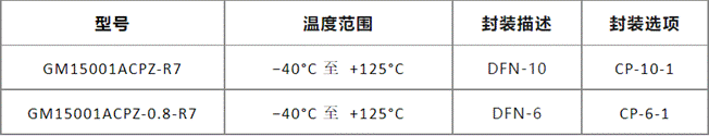 GM15001 采用小型 10 引腳 3mm × 3mm DFN 封裝,具備較低的熱阻,適用于對散熱要求高的應(yīng)用。同時還提供小型 6 引腳 2mm × 2mm DFN 封裝,適用于空間受限型應(yīng)用。