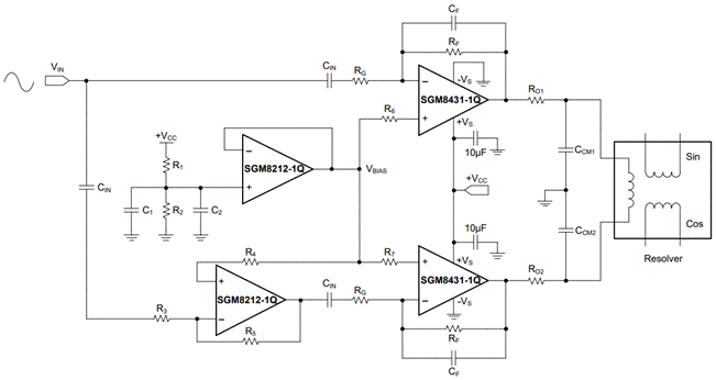 針對混合動力汽車和電動汽車中電機驅(qū)動器的旋轉(zhuǎn)變壓器勵磁需求,SGM8431-1Q 以其高電壓和高輸出電流的特性,特別適合于這些應(yīng)用。在這些應(yīng)用中,SGM8431-1Q 能夠有效替代傳統(tǒng)的由運算放大器和功率晶體管組成的復(fù)雜旋轉(zhuǎn)變壓器勵磁驅(qū)動器,簡化系統(tǒng)設(shè)計。