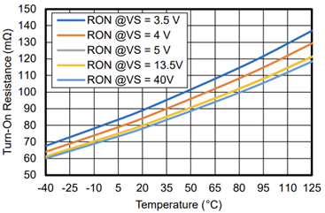 TPS42S40Q的導(dǎo)通電阻標(biāo)稱阻值為100mΩ,與供電電壓呈負(fù)相關(guān),與溫度呈正相關(guān)。這意味著在相同運(yùn)行條件下,溫度越低、供電電壓越高,導(dǎo)通電阻也就越低,如圖4所示。