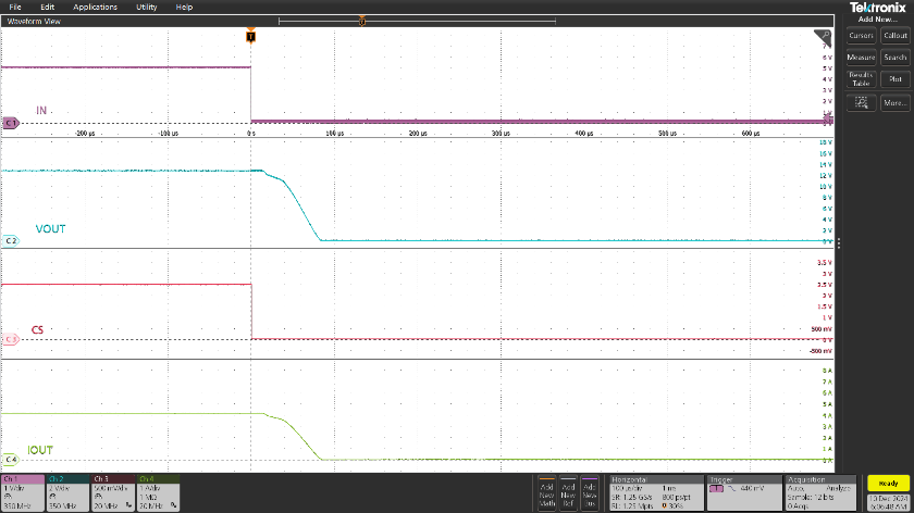 TPS42S40Q在VS=13.5V,IOUT=4A,CS=300ohm,IN OFF的運(yùn)行條件下,具有出色的動態(tài)響應(yīng)性能。輸入關(guān)斷后,對關(guān)斷過程進(jìn)行斜率匹配,將斜率控制在±0.15V/μs,輸出電壓和電流在80μs達(dá)到穩(wěn)態(tài),完成關(guān)斷。如圖5所示。