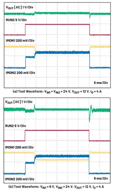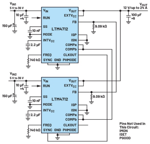 LTM4712支持需要冗余輸入的應用。它可用于需要備用電源的系統(tǒng),或是那些從不同輸入源獲取電源以支持公共負載的系統(tǒng)。圖5顯示了一個示例電路,其中的兩個模塊由不同輸入(VIN1和VIN2)供電,共同為24 A負載提供12 V輸出。值得注意的是,任一輸入電壓下降都不會影響輸出調(diào)節(jié),而且通過連接COMP引腳,峰值電感均流作用始終有效。
