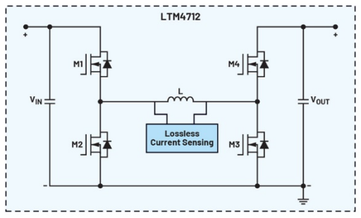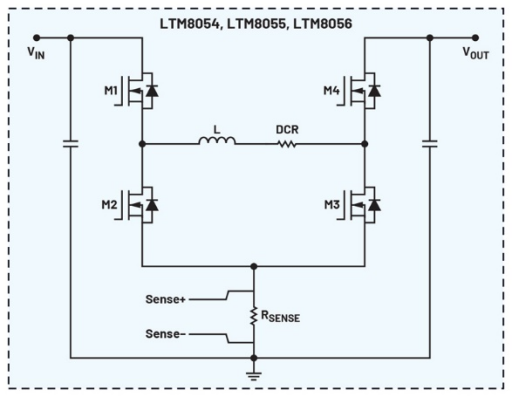 2023年,ADI發(fā)布了新款大電流、四開關降壓-升壓穩(wěn)壓器LTM4712。這是一款36 VIN(最大值)、12 A功率模塊,采用高密度16 mm × 16 mm × 8.34 mm BGA封裝。它采用ADI專有的先進組件封裝技術,將高性能功率電感集成到封裝中。圖3顯示了該模塊中集成的專有電流檢測方案。這不僅節(jié)省了空間,而且還有效減少了額外的功率損耗。該器件采用先進的降壓-升壓控制器和高級ADI封裝,能夠在寬輸入輸出電壓范圍內(nèi)實現(xiàn)超高的功率水平、功率密度、效率和出色的熱性能。