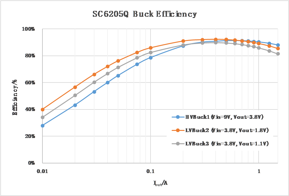 南芯在設(shè)計(jì)階段有效降低了芯片的等效串聯(lián)電阻 (ESR) 和等效串聯(lián)電感 (ESL),提升系統(tǒng)效率。以 SC6205Q 為例,其集成的降壓轉(zhuǎn)換器的峰值效率分別可達(dá) 91.2%、92.2%、89.8%。