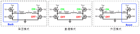 下圖(圖2)所示為 LT8210 電路在升、降壓及直通模式下的工作原理。在不同模式下,ADCD 四個 MOSFET 的工作搭配方式是不同的。LT8210 將自動控制它們不同的開關狀態(tài)、導通狀態(tài)、關斷狀態(tài),實現(xiàn)三種模式間的迅速切換。