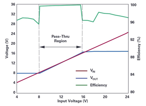 • 當輸入電壓處于 8V-16V 這個設定的窗口電壓區(qū)間時,電路進入直通模式,輸出電壓將跟隨輸入電壓變化,此時效率為 99.9%