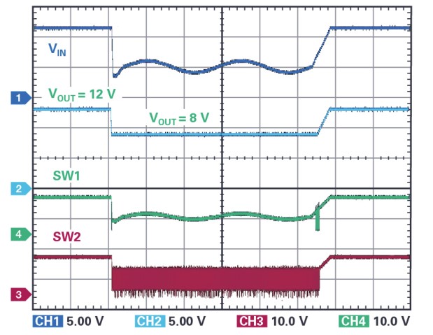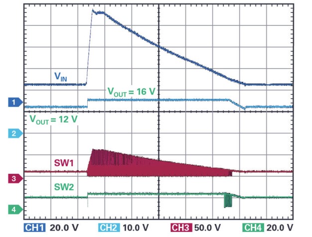 下圖(圖4、圖5)分別顯示了在輸入電壓突然激增(至80V)和突然跌落(至4V)的情況下,LT8210 對輸出電壓的穩(wěn)定作用,以及兩組開關電路的工作狀態(tài)變化。