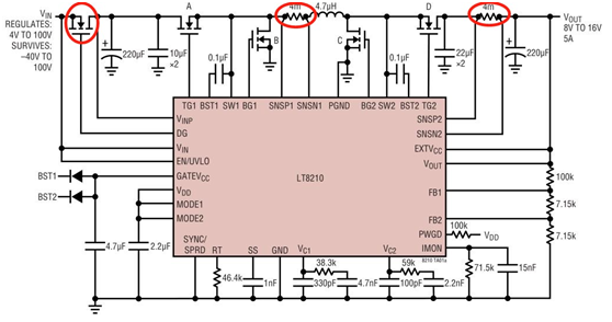 對于電路安全防護功能,LT8210 芯片在設計時就已經(jīng)充分考慮。如下圖(圖6)所示為較完整的 LT8210 應用電路圖,其中紅圈處的設計,分別實現(xiàn)了防反接和電流監(jiān)測限制的功能。這些關鍵器件從前至后串接在電流通路中,由 LT8210 芯片全程采集電壓電流參數(shù)和進行相應控制。