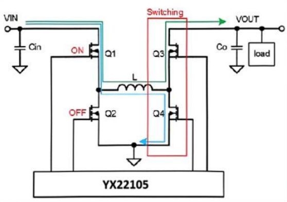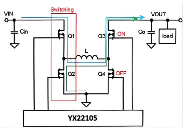 YX22105 能夠根據(jù)輸入輸出電壓自適應(yīng)的進(jìn)入降壓,升壓,升降壓模式;同時(shí)保證模式切換時(shí)具有優(yōu)異的暫態(tài)性能,使輸出的過沖、跌落風(fēng)險(xiǎn)降到最低。