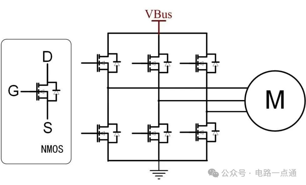 BLDC 的功率級(jí)驅(qū)動(dòng)電路通常由 6 個(gè) N 溝道功率 MOS 管構(gòu)成三相全橋。這 6 個(gè) MOS 管分為兩組,三個(gè)高邊 MOS 連接電源正極(VBus),三個(gè)低邊 MOS 連接電源負(fù)極。通過控制 MOS 管通斷,實(shí)現(xiàn)電流在電機(jī)繞組中分配,推動(dòng)電機(jī)運(yùn)轉(zhuǎn)。
