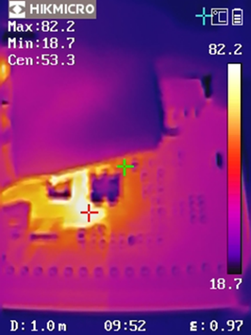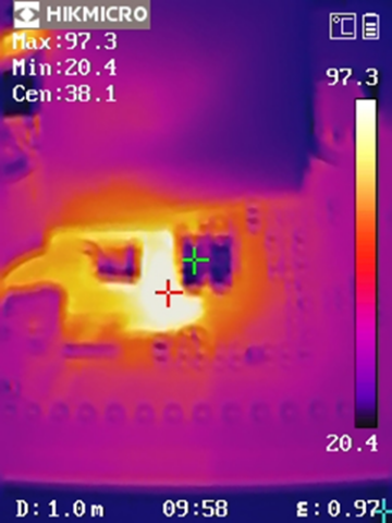 從熱成像圖可以看出,DEMO板在高負載條件下,溫度分布均勻,沒有局部過熱現(xiàn)象。在VIN = 24V, VOUT = 12V, IOUT = 10A 的條件下,最高溫度點為82.2℃,在 VIN = 48V, VOUT = 12V, IOUT = 10A 的條件下,最高溫度點為97.3℃。