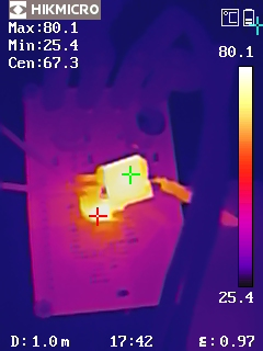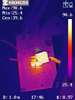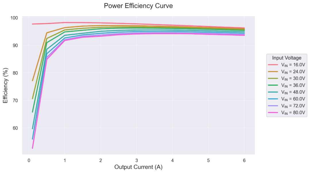 從熱成像圖可以看出,DEMO板在高負(fù)載條件下,溫度分布均勻,沒(méi)有局部過(guò)熱現(xiàn)象。在VIN = 64V, VOUT = 12V, IOUT = 5A 的條件下,最高溫度點(diǎn)為80.1℃,在 VIN = 80V, VOUT = 12V, IOUT = 5A 的條件下,最高溫度點(diǎn)為90.6℃