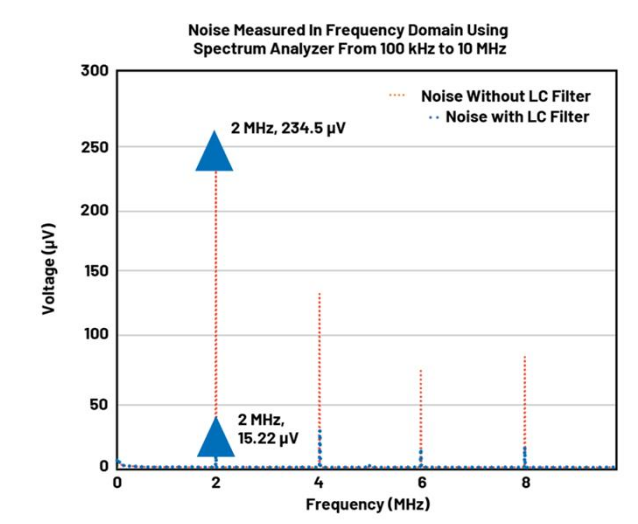 噪聲測量對比如圖3所示。在2 MHz開關(guān)頻率下,無LC的輸出開關(guān)紋波為234 V,添加0603鐵氧體磁珠后大幅降低至15 V。