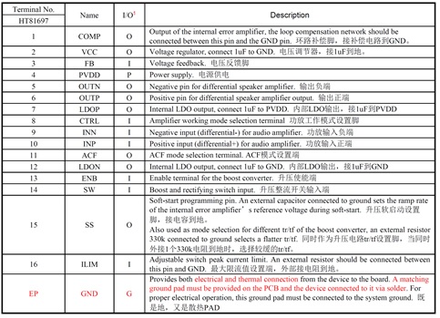 HT81697具有先進(jìn)的擴(kuò)頻功能來抑制EMI。如果系統(tǒng)對EMI高度敏感,則可以將升壓關(guān)閉,并將功放切換到AB類。 此外,HT81697集成了輸出端過流保護(hù)、片內(nèi)過溫保護(hù)、升壓過壓保護(hù)等功能。