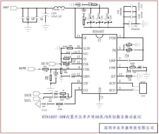 深圳市永阜康科技有限公司現(xiàn)在力推1-2節(jié)鋰電池供電、內(nèi)置升壓30W單聲道音頻功放IC-HT81697。突破了鋰電池供電的局限性,為消費(fèi)者提供了更為優(yōu)質(zhì)的聽覺體驗(yàn):功率更大,音質(zhì)更好,低音更足。