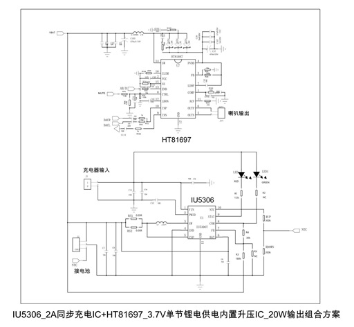 IU5306_2A同步充電IC+HT81697_3.7V單節(jié)鋰電池應(yīng)用20W輸出原理圖。