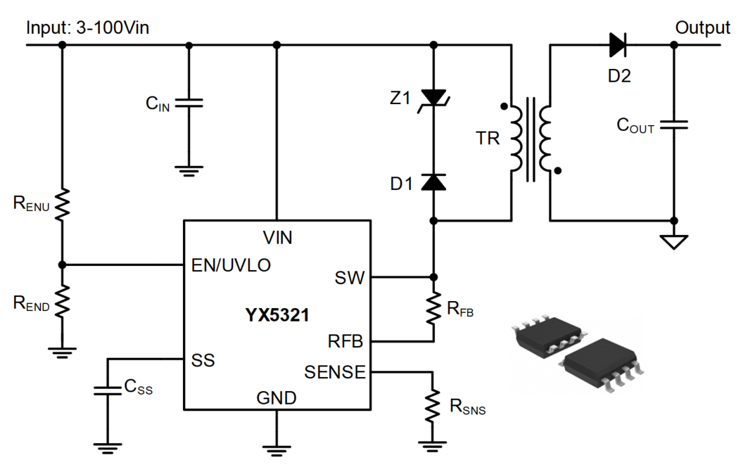 YX5321 PSR控制芯片支持高達(dá)100V輸入范圍,集成200V功率開關(guān)管,最大電流支持2A。集成的原邊控制保證輸出電壓高準(zhǔn)確度,且只需要一顆電阻設(shè)置輸出電壓,大大簡(jiǎn)化了外圍電路,增加了可靠性。同時(shí)軟啟動(dòng),輸出短路保護(hù),OTP等功能保證整個(gè)電源安全地運(yùn)行。