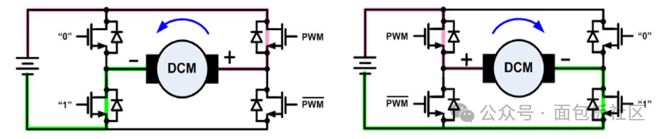 如果需要控制速度、扭矩和方向,則采用由電子開關(guān)(晶體管、IGBT或MOSFET)組成的“ H橋”來驅(qū)動電機向任一方向旋轉(zhuǎn)。施加到電機上的電壓可以是任一極性,它使電機沿不同方向旋轉(zhuǎn)。而通過調(diào)制開關(guān)脈沖的寬度可以控制電機的速度或扭矩。