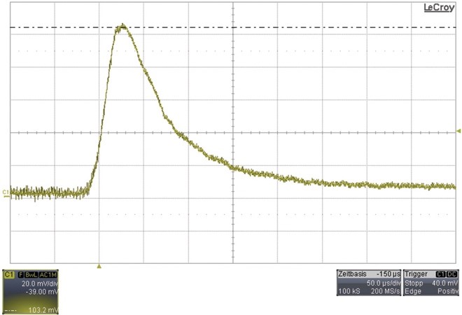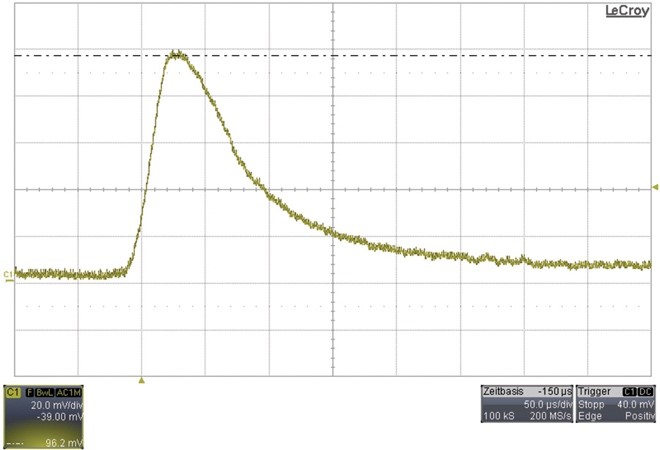 圖3顯示了在負(fù)載瞬態(tài)響應(yīng)期間交流耦合輸出電壓中的電壓尖峰,其測(cè)量設(shè)置如圖1所示。峰值電壓約為103 mV。相比之下,圖4顯示了連接線的導(dǎo)線整齊絞合在一起(如圖2所示)時(shí)的測(cè)量結(jié)果。此時(shí),輸出電壓中的電壓尖峰只有大約96 mV。這相當(dāng)于大約7 mV的差異,它表明連接線的整齊排列可導(dǎo)致該負(fù)載瞬態(tài)測(cè)試結(jié)果改善大約7%。