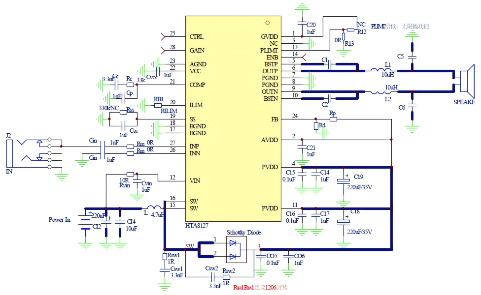HTA8127是一款內(nèi)置升壓的單聲道D類音頻功放IC,其支持單節(jié)鋰電、雙節(jié)鋰電串聯(lián),5V、12V等多種輸入,升壓后的電壓提供給功放供電,功放支持單聲道BTL輸出。HTA8127內(nèi)部集成免濾波器調(diào)制技術(shù),能夠直接驅(qū)動揚聲器,內(nèi)置的關(guān)斷功能使待機電流最小化,還集成了升壓電壓過壓保護、輸入電源欠壓異常保護、輸出端過流保護、片內(nèi)過溫保護等功能。HTA8127內(nèi)置的升壓電路,可通過FB腳設(shè)置升壓值,以滿足不同的輸出功率需求。其還可通過外置電阻調(diào)節(jié)開關(guān)峰值電流限值。