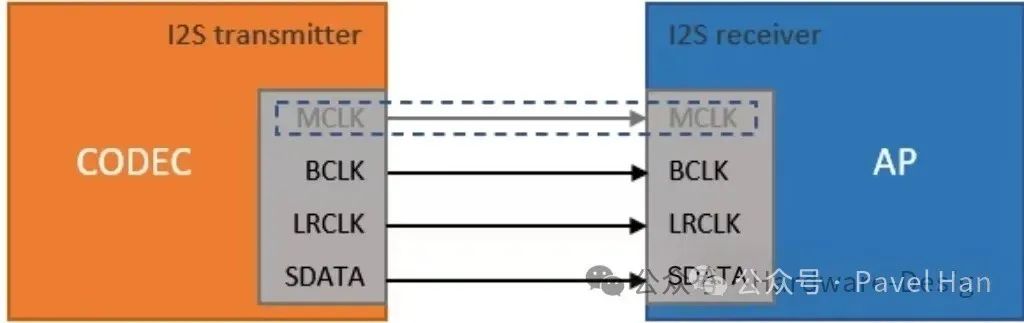 I2S(Inter-IC Sound)是一種同步串行接口,專門用于音頻數(shù)據(jù)的傳輸,具有簡(jiǎn)單、高效和抗干擾能力強(qiáng)的特點(diǎn)。I2S接口傳輸?shù)氖菙?shù)字音頻數(shù)據(jù),通常以PCM(脈沖編碼調(diào)制)格式表示,實(shí)際上也就是Audio Codec中從麥克風(fēng)采集語(yǔ)音數(shù)據(jù)經(jīng)過(guò)AD轉(zhuǎn)換后的數(shù)字音頻數(shù)據(jù),或者從DSP接收到的、需要通過(guò)Audio Codec進(jìn)行DA轉(zhuǎn)換后在揚(yáng)聲器播放出來(lái)的數(shù)字音頻數(shù)據(jù)。