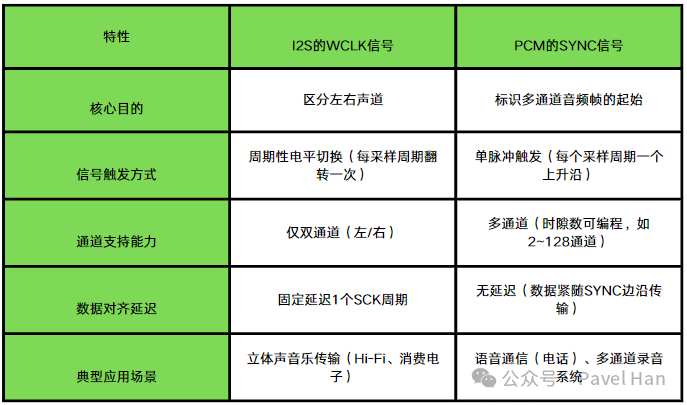 從以上PCM接口所包含的數(shù)據(jù)線可以看到,PCM_CLK、PCM_DIN、PCM_DOUT的定義與I2S沒有區(qū)別,雙方之間的區(qū)別主要是在I2S的WCLK和PCM的PCM_SYNC上。