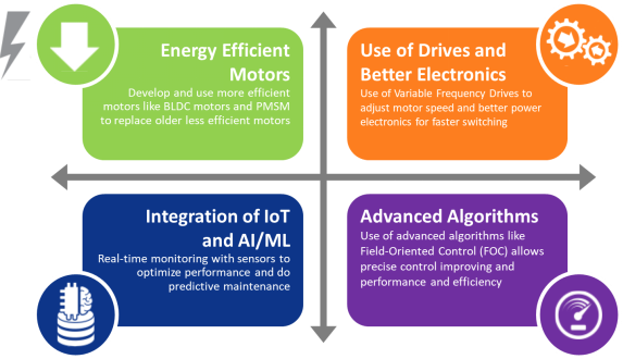 電機(jī)能效的主要發(fā)展趨勢(shì)之一是從傳統(tǒng)電機(jī)(如交流感應(yīng)電機(jī))向更高效的類型過渡,包括無刷直流電機(jī)(BLDC)、永磁同步電機(jī)(PMSM)和內(nèi)置式永磁電機(jī)(IPM)。這些電機(jī)具有更高效率和更優(yōu)性能。此外,材料技術(shù)的進(jìn)步(如非晶金屬和稀土磁體的應(yīng)用)進(jìn)一步提升了電機(jī)效率。