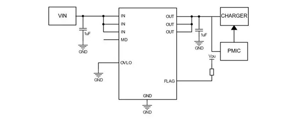 ET9545L是一款5.5A持續(xù)電流能力具有過壓保護(hù)和濕度檢測功能的大電流保護(hù)器件。在使用濕度檢測時,MD引腳連接IN或GND時觸發(fā)。將器件的MD引腳放置在靠近IN腳的位置,在正常情況下,MD引腳處于懸空態(tài),此時VB=0.9V<VMDT=1.2V<VA=2.2V,未檢測到水分;如果有水汽此時在USB接口上,導(dǎo)致MD引腳連接到IN,則IN電壓將通過MD引腳傳輸?shù)絍MDT,此時VMDT>VA,檢測到水分,F(xiàn)LAG通過控制邏輯設(shè)置為高;如果USB接口的水汽導(dǎo)致MD引腳連接到GND,則VMDT<VB,檢測到水分,F(xiàn)LAG通過控制邏輯設(shè)置為高。檢測到水分至FLAG拉高,響應(yīng)時間為1ms。