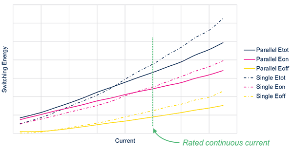 開(kāi)關(guān)能量的變化曲線不是線性的,略呈指數(shù)趨勢(shì)。因此,電流加倍會(huì)導(dǎo)致能量增加超過(guò)兩倍。并聯(lián)時(shí),結(jié)果正好相反:如果將電流均分到兩個(gè)相同的器件,總開(kāi)關(guān)能量會(huì)比單個(gè)器件單獨(dú)開(kāi)關(guān)時(shí)更低。